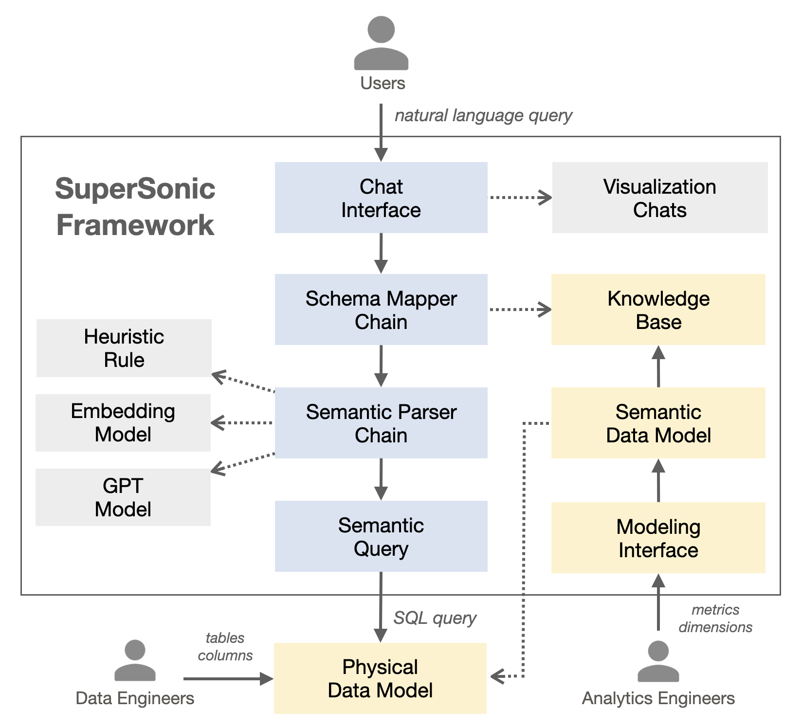 # 超音数(SuperSonic) **超音数是一个开箱即用且易于扩展的数据问答对话框架**。通过超音数的问答对话界面,用户能够使用自然语言查询数据,系统会选择合适的可视化图表呈现结果。超音数不需要修改或复制数据,只需要在物理数据模型之上构建逻辑语义模型(指标/维度/实体的定义,以及他们的业务含义、相互间关系等),即可开启数据问答体验。与此同时,超音数被设计为可插拔式的框架,允许以插件形式来扩展新功能,或者将核心组件与其他系统集成。 ## 项目动机 大型语言模型(LLMs)如ChatGPT的出现正在重塑信息检索的方式。在数据分析领域,学术界和工业界主要关注利用深度学习模型将自然语言查询转换为SQL查询。虽然一些工作显示出有前景的结果,但它们还并不适用于实际场景。 在我们看来,为了在实际场景发挥价值,有两个关键点: 1. 将基于规则和基于模型的语义解析器相结合,发挥各自优势,以便处理不同的场景。 2. 引入语义模型层来封装数据底层的复杂性(关联、公式等),从而简化语义解析的求解空间。 为了验证上述想法,我们开发了超音数项目,并将其应用在实际的内部产品中。与此同时,我们将超音数作为一个可扩展的框架开源,希望能够促进数据问答对话领域的进一步发展。 ## 开箱即用的特性 - 内置图形界面以便业务用户输入数据查询。 - 内置图形界面以便分析工程师管理语义模型。 - 支持文本输入的联想和查询问题的推荐。 - 支持多轮对话,根据语境自动切换上下文。 - 支持三级权限控制:主题域级、列级、行级。 ## 易于扩展的组件 超音数的整体架构和主流程如下图所示: - **问答对话界面(chat interface)**:接受用户查询并选择合适的可视化图表呈现结果,支持输入联想和多轮对话。 - **语义建模界面(modeling interface)**:使分析工程师能够通过可视化方式定义和维护语义模型,与访问权限和聊天对话相关的配置也可以在用户界面上设置。 - **模式映射器(schema mapper chain)**:基于语义模型构建知识库,然后将自然语言文本在知识库中进行匹配,为后续的语义解析提供相关信息。 - **语义解析器(semantic parser chain)**:理解用户查询并抽取语义信息,其由一组基于规则和基于模型的解析器组成,每个解析器可应对不同的特定场景。 - **语义查询(semantic query)**: 根据语义信息生成物理SQL执行查询。 ## 快速体验 超音数自带样例的语义模型和问答对话,只需以下三步即可快速体验: - 从[release page](https://github.com/tencentmusic/supersonic/releases)下载预先构建好的发行包 - 运行 "bin/start-standalone.sh"启动服务 - 在浏览器访问http://localhost:9080 开启探索 ## 如何构建 超音数可以运行在两个模式:standalone(一般用于快速演示)和distributed(一般用于生产环境)。 ### Standalone模式构建 下载源码包,运行脚本"assembly/bin/build-standalone.sh",将所有服务一起编译打包 ### Distributed模式构建 下载源码包,分别运行脚本"assembly/bin/build-chat.sh"、"assembly/bin/build-semantic.sh",为问答层服务和语义层服务编译打包